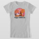 Camiseta fofa do Halloween com gnomo, fantasma, abóboras e árvores de queda com lua rosa no fundo. O texto da camiseta é personalizável.