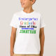 Formando da escola do jardim de infância. Personalize o nome dos rapazes ou raparigas em negrito texto verde maiúsculo. Inserir Classe de Ano atual em texto preto. Personalize o nome da escola em texto azul. Design colorido em texto vermelho, laranja, verde, dourado, azul, roxo, preto. Personalize o nome da escola em texto azul. Design de Tipografia original © TamiraZDesign.