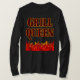 Churrasco engraçado da Rainha Grill dizendo em uma fonte flamejante ocidental para cozinheiros e cozinheiros. Com arte gráfica de chamas vermelhas e laranja no fundo do design. Outro original da MomsRetro.