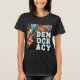 Mostre seu lado ranzinza enquanto mostra sua apreciação da democracia, com esta camiseta atraente. A palavra "Democracia" está em letra retrógrada, dividida em três linhas. O fundo é um design abstrato florescente como folhas coloridas crescendo.