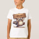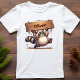 Esta divertida camiseta infantil personalizada apresenta um adorável guaxinim gorducho segurando uma placa de nome de madeira superdimensionada, Com um rabo fofo esticado para equilibrar, e um pé levantado no meio da queda, este design adorável é perfeito para personalização.