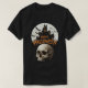 Um clássico e assustador design do Dia das Bruxas apresentando um crânio rachado em frente a um castelo assombrado sob uma lua de cheio com morcegos voadores. Este gráfico atmosférico é perfeito para quem ama imagens e horror tradicionais do Halloween.