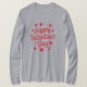 This design features a grey t-shirt with long sleeves and red text displying Happy Valentine's Day and ute red hearts surrounding the text.