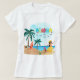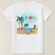 Fuja ao paraíso com esta camiseta maravilhosa inspirada no Havaí! Apresentando uma cena de praia tropical com cor d'água sonhadora, palmeiras verdes e uma adorável garota dançando Hula irradiando aquelas vibrações despreocupadas de Aloha, esta camiseta é seu acessório perfeito para dias de praia, férias ou simplesmente carregando um pouco de sol com você aonde quer que você vá.