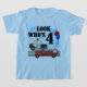 Um cruzador da polícia, motor de incêndio, balões e texto que diz "Olha quem é 4" aparece no nosso design de aniversário do Dia 4 de Heróis.