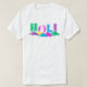 Camisa Holi com HOLI em cores diferentes e pilhas cor-de-rosa, verde, azul, roxa e amarela de pó colorido.