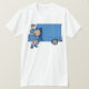 Este design é um homem e uma camionete de entrega. A camionete de entrega é azul e o homem de entrega é ereto fora ele que leva uma caixa para a entrega. Estes olhares do design do homem e da camionete de entrega grandes