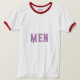 Texto ou Nome Homens ou Palavra com Texto a Cor da Lavanda e O Estilo é Camiseta Básica de Ringer, O tipo de Cor é Branco/Vermelho e o Tipo de Tamanho é Adulto L.