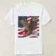 Uma águia majestosa em voo de médio, suas asas completamente espalhadas e o fundo é vibrante, bandeira americana.