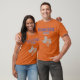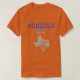 The T-shirt design saying "Houston," "Texas" and "Space City" is colored Texas Orange with azure, dark blue, deep blue, grey, royal blue and white ink in it. It is made out of 100% cotton.