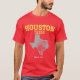 The T-shirt design saying "Houston," "Space City" and "Texas" is colored red with bright yellow, grey, orange, white and yellow orange ink in it. It is made out of 100% cotton.