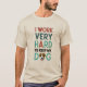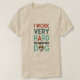 The minimalist design features the phrase "I work very hard to keep my dog" in large, highly readable green and red letters. A contrast is established between the seriousness of the message and the humorous reality involved in the effort dedicated to caring for a pet.