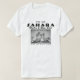 T-shirt branca com desenho de uma banda de música africana com "A GRANDE SAHARA RHYTHM & BLUES BANDA TIMBUKTU, MALI PERTO DO NÍGER DO RIO", com I-BONE LTD. Há bandas musicais dentro e em volta do deserto do Saara no Norte de África que tocam seu próprio estilo singular de Rhythm and blues. Esta camisa homenageia-os.