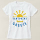 Camiseta branca feminina com o design da Ilha de Santorini, Grécia - Sunshine. Este design é para você se quiser desfrutar dele enquanto estiver em Santorini ou como uma lembrança de suas belas férias na Grécia.
