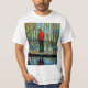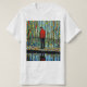 A.I.assistiu impressão de um homem em um casaco vermelho se posiciona em um caminho refletido em um corpo de água enfeitado com pedras coloridas, cercado por uma cena surreal de videiras vibrantes penduradas e folhas circulares, sentindo-se indesejado por outros no seu mundo.