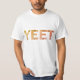 The T-shirt showcases the word "YEET" in large, block letters with a grey, metallic finish. Each letter is accented with small, silver screws at the corners, giving it a rugged, industrial look. The design is simple yet striking, making a bold statement without being overly complicated.