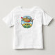 Esta t-shirt personalizada de crianças apresenta um brilhante hidrocartoon amarelo e vermelho, lançando-se sobre uma alegre floresta de árvores sorridentes num crachá circular impressionante.