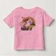 Dons de conto de fadas com Unicórnio branco, castelo e arco-íris bonito. Unicórnio tem vento soprando mano e cauda fluentes com flores em primeiro plano. Um design mágico em vários produtos para deleitar o amante da fantasia.