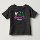 Uma camiseta personalizada de formatura na educação infantil para uma criança que se forma na pré-escola e vai para o jardim de infância. Ela apresenta uma adorável coruja rosa usando um chapéu de formatura e carregando um pergaminho ao lado de uma fonte divertida em azul, verde e rosa.