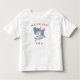 Camisa de aniversário de um menino com tema de tubarão bonito apresentando uma ilustração de um tubarão com um chapéu de festa vermelho e branco. O texto acima diz "cuidado!" Adicione a idade do seu filho na base.