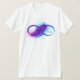 Símbolo do infinito com uma bela pena pintada em cores vibrantes roxas e azuis sobre um fundo branco.