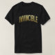 Uma design escura e misteriosa que apresenta a palavra "Invencível" em uma fonte gótica, dourada, com um fundo industrial texturizado.