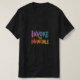 O design de t-shirt apresenta a frase "Invoke the Invincible" numa letra corajosa e multicolor. Cada palavra poderia ser uma cor vibrante diferente, criando um olhar dinâmico e atraente.
