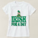 Características de design bonitos do dia deste St Patrick um leprechaun verde pequeno com um trevo grande em seu chapéu que senta-se sobre irlandês do grande texto verde "por um dia.