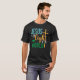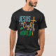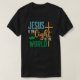 Esta camisa preta apresenta "JESUS" em tom, "é o" em branco com uma onda lacrimogênea, "Light" num guião cor de laranja com uma cruz lacrimogênea, "OF THE" em branco e "WORLD" em verde com uma linha vertical teal. Estão também presentes pequenos corações verdes. Esta design oferece uma mensagem religiosa.