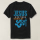 Esta t-shirt preta apresenta o nome "JESUS" numa fonte azul, grande e texturizada, no topo. Abaixo, a frase "IS O" está em uma fonte branca menor, flanqueada por formas decorativas de diamante. As palavras "FONTE DE" estão empilhadas sob uma fonte branca semelhante. A palavra "Vida" é exibida em um roteiro azul, com o "t" estilizado como uma cruz. Esta design expressa uma crença religiosa cristã.