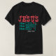 Esta camiseta preta exibe o nome "Jesus" em letras grandes, vermelhas, ligeiramente angustiadas, enfeitiçadas com pequenos corações cor-de-rosa. Abaixo, a frase "The Way The Truth The Life" é escrita em uma letra pequena, ligeiramente menor, com uma cruz teal incorporada ao "t" da "Verdade". Na parte inferior, "John 14:6" é impresso em letras. Esta design expressa um tema religioso cristão