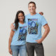 O t-shirt azul que caracteriza uma versão da cor do cobrir da edição #19, parte traseira é versão preto e branco da edição #28 do cobrir traseiro.