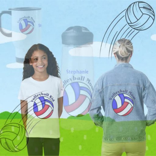 O garoto de vôlei sobre um vôlei vermelho, branco e azul. As costas mostram o mesmo vôlei passando por uma rede.