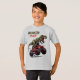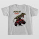 Qualquer garoto que ama dinossauros e caminhões monstros amará essa camiseta. A imagem é de um T-Rex verde montando um caminhão monstro vermelho. O texto verde e vermelho correspondente diz "MONSTER Truck".