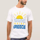 Desfrute deste verão com esta T-shirt branca masculina com desenho de sol e ondas do mar de Korinos, Grécia. Este design apresenta ondas de sol e água com Korinos em fonte estilo grego com uma grande palavra azul Grécia.
