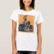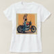 A digital illustration featuring a confident, attractive woman with long, wavy blonde hair and tanned skin, wearing sunglasses, a black crop top, tight blue jeans, and black boots. She stands beside a red and chrome vintage motorcycle against an orange background. The style is reminiscent of 1980's comic art, with bold lines and vibrant colors.