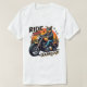 Design de Latido alto com um cachorro legal em uma jaqueta de couro e óculos de sol montando uma motocicleta laranja feroz contra uma linha do horizonte da cidade. Perfeito para roupa, amantes de cães e designs de roupa de rua exclusivos.