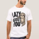 Um design de vetor de tendência com uma t-shirt branca com uma ilustração de preguiça. A preguiça tem uma expressão cansada e preguiçosa, com olhos sonolentos e uma postura relaxada. O texto "LAZY SOBRE VOCÊ" é ousado