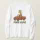 Uma design única e divertida de uma girafa montando um caminhão antigo com um símbolo ✌️ paz e a frase PEACE & LOVE. Fundo transparente, perfeito para t-shirts, adesivos ou posters que espalham alegria e positividade.