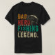Esta camiseta preta apresenta o texto "LEGENDA DE PESCA HERÓI PAI" empilhado verticalmente numa mistura de letras laranja, vermelha, lacre e bloco creme. Uma ilustração detalhada de um peixe-robalo grande é posicionado à direita da palavra "HERO". A design celebra um pai que gosta de pescar e é visto como herói e lenda.