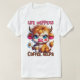 A funny and sarcastic design showcases a cute highland cow sitting with a beautiful white daisy and a to-go coffee cup. The cow, with big blue eyes and a serious expression, sports a lipstick kiss on his cheek and vibrant orange-and-white fur. The colorful text reads, "Life happens, coffee helps." This design is available on various products, making perfect gifts for coffee lovers.