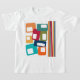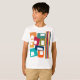 A camiseta desta criança tem uma design de linhas e retângulos modernos do século médio em tons retrorados de laranja, ouro, amora, chalé, verde, azul, turquesa e verde.