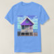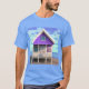 Tee em uma pequena cabana de praia/casa de férias em pernas, pintada de branco e roxo, na areia, com céu azul e nuvens brancas