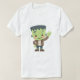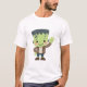 Um desenho animado e amigável do monstro de Frankenstein. Ele tem pele verde-clara, bochechas rosadas e cabelos pretos irregulares. Vestido em uma jaqueta marrom, uma camisa branca, e calças azuis, ele está alegremente balançando com a mão. A ilustração apresenta pontos de assinatura e parafusos metálicos na cabeça do personagem. O fundo é preto sólido.