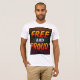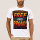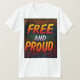 A design da camiseta "Livre e Orgulhosa" apresenta um fundo abstrato com padrões giratórios e linhas em negrito vibrantes. As palavras "Gratuito e Orgulhoso" aparecem de forma destacada numa variedade de cores brilhantes e contrastantes, com tipografia pormenorizada e letras nítidas e nítidas. O design é atencioso e impactante, transmitindo uma mensagem de liberdade e de autoexpressão.