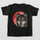Uma pintura acrílica de um lobo cinzento com os olhos vermelhos de incandescência na frente de uma lua vermelha.