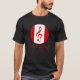 A frente desta camiseta branca estiva o logotipo oficial do artista gravador Scott Ruhs. O design baseia-se na bandeira canadense com um fundo branco e bares verticais de vermelho nos lados esquerdo e direito de um emblema circular. Neste logotipo design, a folha vermelha de bordo que normalmente se encontra na bandeira canadiana foi substituída por uma clave vermelha de mesa. O slogan de Scott "Let The Music Play!" é mostrado na parte de trás da camiseta em um roteiro vermelho.