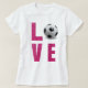 Love Soccer word design com letras faíscas cor-de-rosa quente e o "o" é substituído por uma bola de futebol.