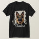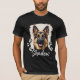 This is a black t-shirt featuring a realistic, painterly portrait of a German Shepherd dog. The dog's face is framed by a rough, artistic brushstroke border, with the name "Shadow" written in a bold, brush-style font and paw prints stamped around the design. It's perfect for German Shepherd lovers.