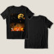 Esta design de camiseta apresenta uma cena clássica do Dia das Bruxas, misturando areia e elementos festivos. No centro estão jack-o-lanternas brilhantes com grãos esculpidos, radiando um brilho quente e assombroso. Acima, silenciada contra uma grande lua de cheio, uma bruxa voa sobre sua vassoura, lançando uma atmosfera mágica e assustadora. As teias e aranhas balançando a um ritmo ameaçador, enquanto os morcegos voam pelo céu noturno, somando-se ao ambiente estranho. Um gato preto com olhos perfurantes fica perto das abóboras, aumentando a misteriosa vibração sobrenatural. O ousado contraste entre preto e laranja torna este design perfeito para o Halloween, evocando diversão, mistério, e um pouco de magia. Ideal para aqueles que amam abraçar o espírito do Halloween em estilo!